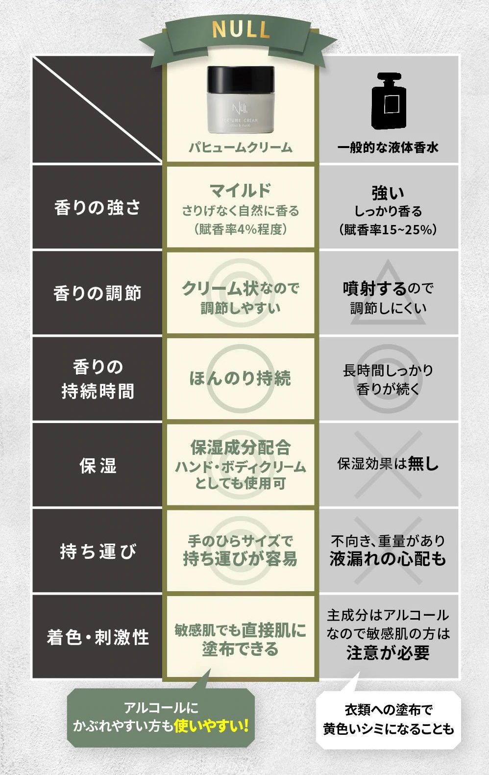 NULLパヒュームクリームと一般的な香水を比較すると上記のような感じです。